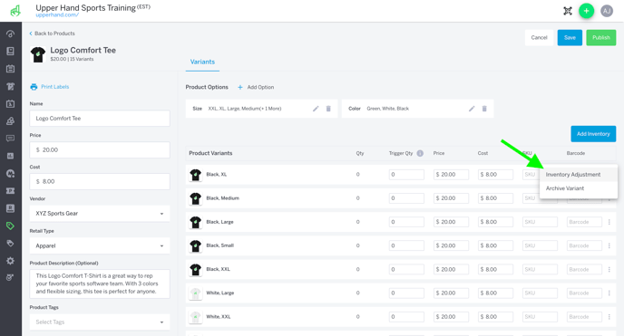 - Find the variant of that product you need to adjust and click the 3 dots on the listed variant and then click Inventory Adjustment