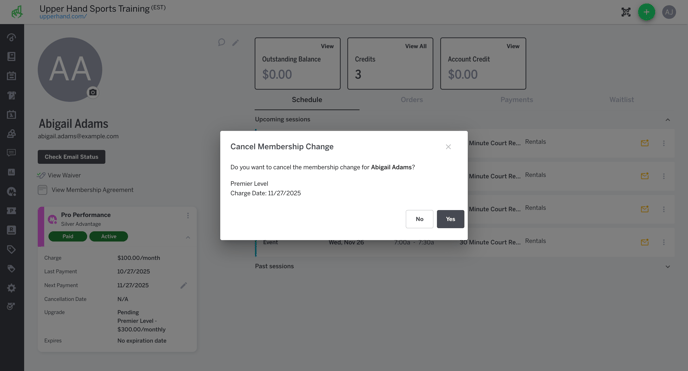 - The Cancel Membership Change modal will populate with the details of the upgrade/downgrade previously selected