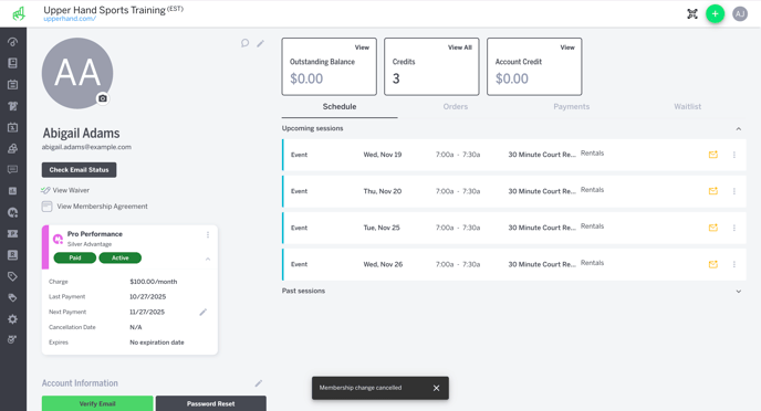 - Under the Clients tab, search for the client you need to cancel their membership and click on their name to navigate to their specific Client Profile Page