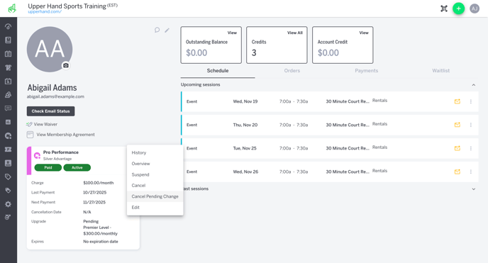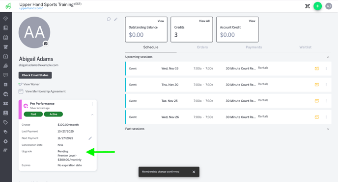 - Click the drop down arrow on the existing membership card to see the pending membership upgrade/downgrade is now removed