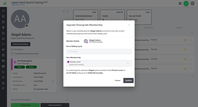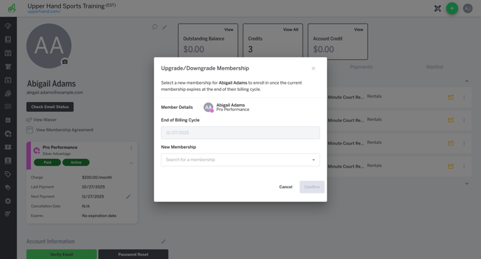 - The Upgrade/Downgrade modal will populate and ask you to select a new membership for the client to be enrolled in once their current membership expires at the end of their billing cycle.